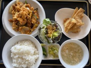 豚肉と卵のピリ辛炒めと揚げワンタン!